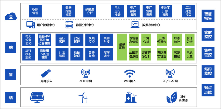 可接入并管理风电、光伏、生物质、水电等新能源及传统能源发电数据,实现省级范畴,对多样能源类型的综合管理,便于电力服务机构根据供电及用电信息对电网进行维护管理。方便主管部门及时,完整的了解行政区域内的能源产业发展情况,制定专项发展政策。