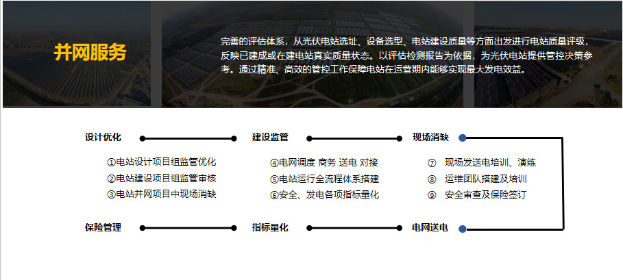 1、并网服务 组建专业的前期介入小组,提前1-2个月入场。运维团队于建设阶段,提供利于长线运维的专业意见,辅助业主监督。通过对建设工作的协调督导,提供全站消缺验收确认,提高项目质量。同步,根据工作前置的综合情况,为业主制定并实施高度个性化的并网后运维方案,提高运维实效。